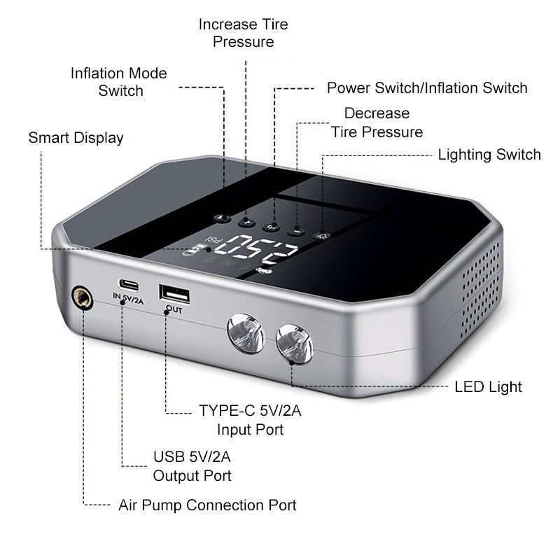 Inteligentna funkcja pompowania z kontrolą ciśnienia za pomocą jednego przycisku: dzięki wbudowanej pompie można łatwo napompować opony samochodowe, motocyklowe lub rowerowe. Po ustawieniu docelowego ciśnienia urządzenie automatycznie zatrzymuje pompowanie. Cyfrowy wyświetlacz pokazuje w czasie rzeczywistym postęp pompowania i aktualne ciśnienie w oponach.