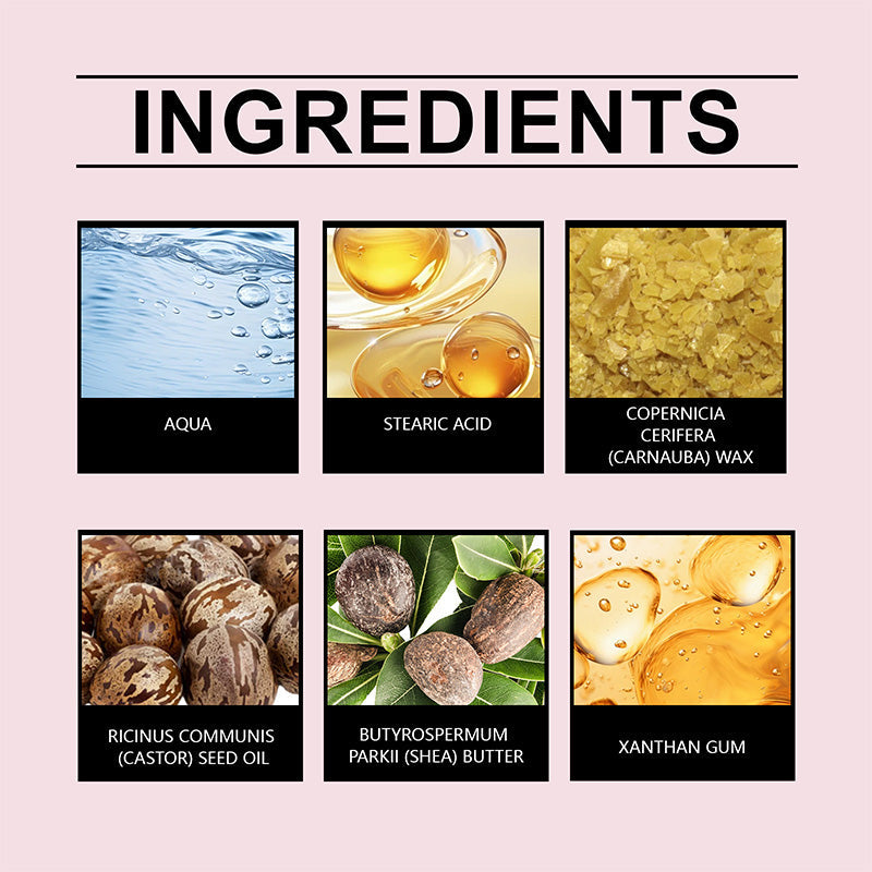 Składniki aktywne: woda, kwas stearynowy, olej rycynowy, guma ksantanowa, masło shea, wosk carnauba