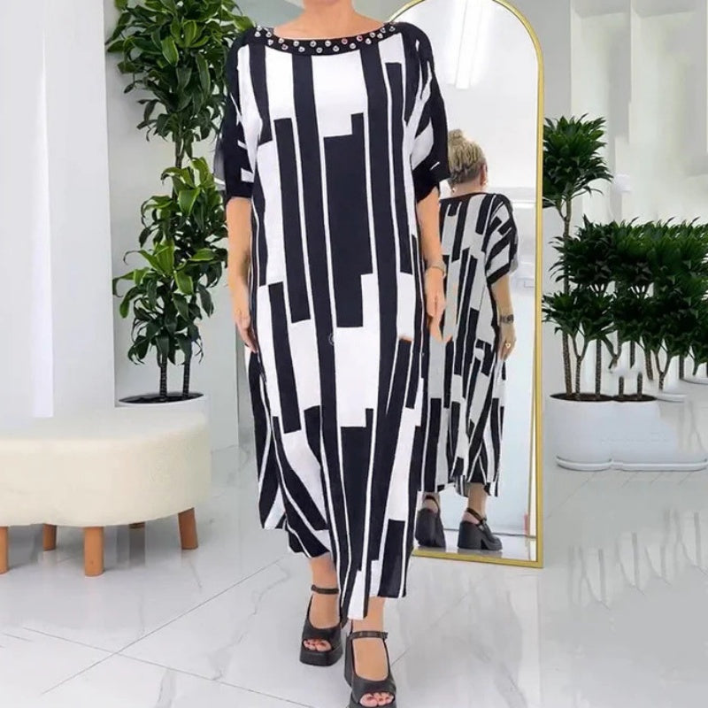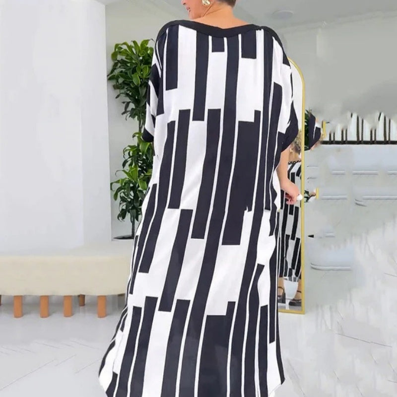 NOWOCZESNY STYL - Zaprojektowana z eleganckim czarno-białym nadrukiem, ta sukienka stanowi odważną deklarację mody, zachowując jednocześnie ponadczasową elegancję, która pasuje zarówno do codziennych, jak i półformalnych okazji.
