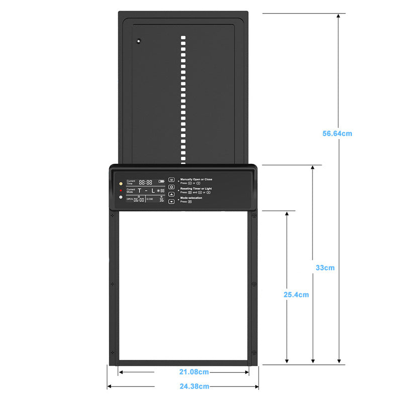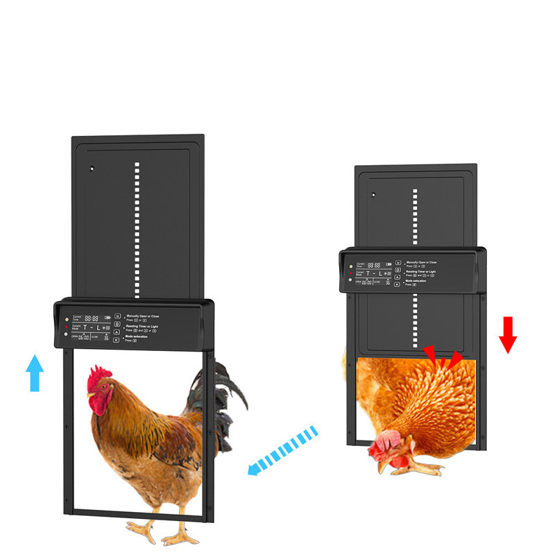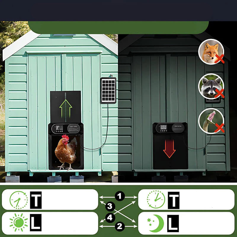 Wiele trybów sterowania – sterowanie bramą za pomocą pilota lub ręcznie zapewnia najwyższą wygodę. Wyposażona w czujnik światła i funkcję timera, umożliwia łatwą regulację położenia bramy wewnątrz lub na zewnątrz, zapewniając płynne zarządzanie kurnikiem.