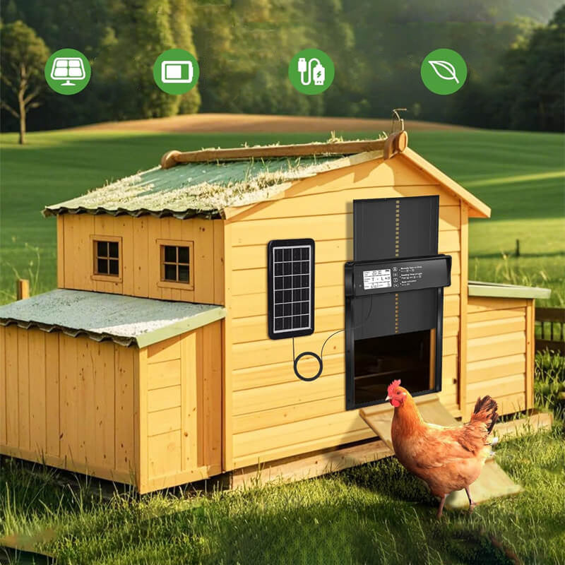 Bezpieczna i trwała konstrukcja – zastosowano zabezpieczenie przed przytrzaśnięciem, zapewniające bezpieczeństwo stada kurczaków. Drzwi wykonano z wysokiej jakości stopu aluminium i tworzywa ABS, dzięki czemu są odporne na warunki atmosferyczne, trwałe i łatwe w montażu, zapewniając wiele lat bezpiecznego użytkowania.