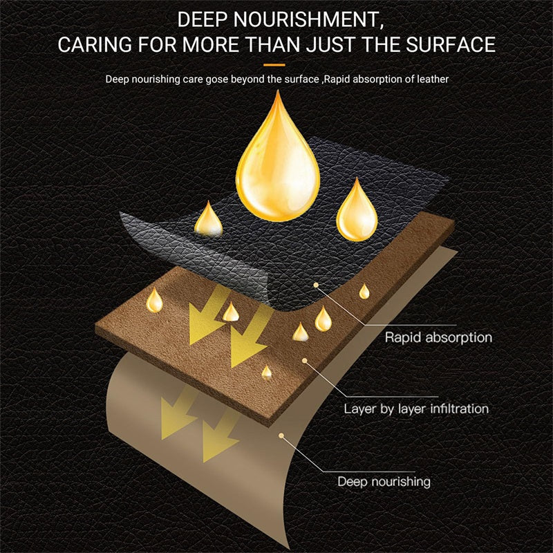 GŁĘBOKIE ODŻYWIANIE – Nie tylko chroni wyroby skórzane, ale także dzięki bogatym składnikom wnika głęboko w skórę, odżywiając ją i naprawiając drobne pęknięcia, uzupełniając oleje, aby zapobiec wysychaniu i pękaniu, przywracając miękkość skóry.