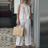 Klasyczny, a zarazem szykowny design. Okrągły dekolt i top bez rękawów świetnie komponują się z szerokimi spodniami, tworząc nowoczesny i elegancki look.