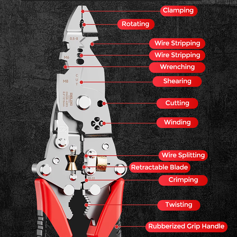 Wielofunkcyjne narzędzie 16 w 1: łączy w sobie funkcje zdejmowania izolacji, cięcia, rozdzielania, wkręcania, gięcia rur i wiele innych w jednym wszechstronnym narzędziu – idealnym do szerokiego zakresu zadań elektrycznych i mechanicznych.