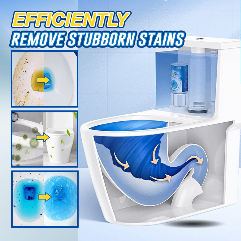Wszechstronne czyszczenie: Ze zbiornika toalety wypływa lśniący niebieski strumień wody, który Czyszczenie obręczy toalet, wnętrza, rur spustowych i innych elementów Dokładnie wyczyść toalety.