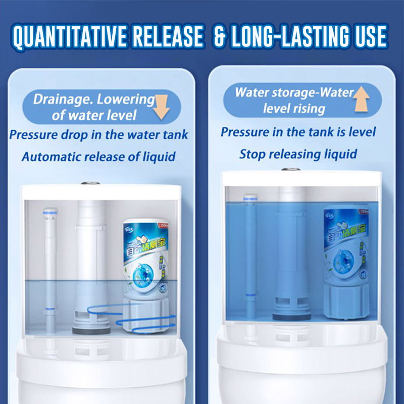 Uwalnianie ilościowe i trwałe użytkowanie: Skoncentrowany płyn rozpuszcza się równomiernie i automatycznie usuwa brud, podczas gdy the Formuła o powolnym uwalnianiu może być płukana ponad 4000 razy (około 6 miesięcy).