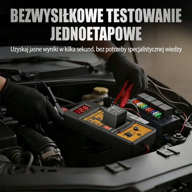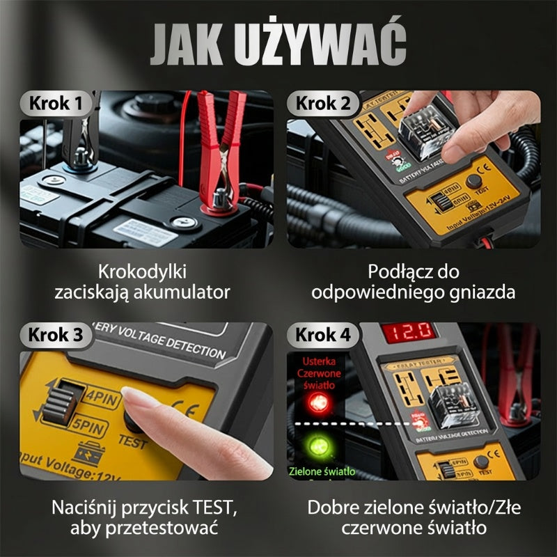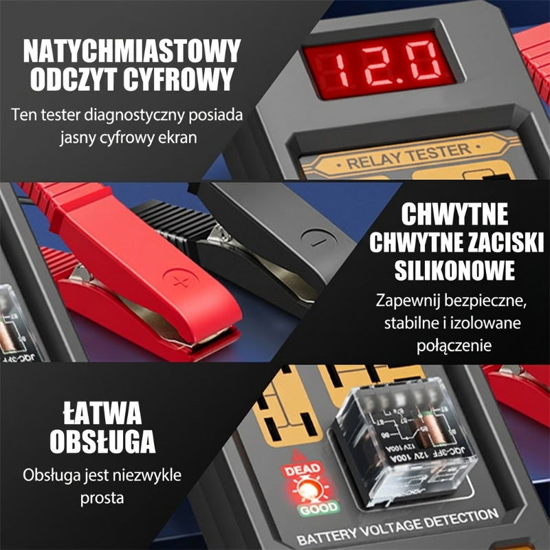 PROSTA OBSŁUGA - Obsługa jest niezwykle prosta: wystarczy podłączyć oznaczone kolorami zaciski do odpowiednich biegunów akumulatora pojazdu i wpiąć przekaźnik do gniazda. Urządzenie natychmiast się włącza i wyświetla czytelny wynik diagnostyczny.