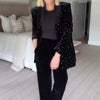 PEŁNE ZDOBIENIA Z DŻETÓW: Ozdobiona połyskującymi kryształkami na całej długości marynarki, co dodaje jej blasku i wyrafinowania.
