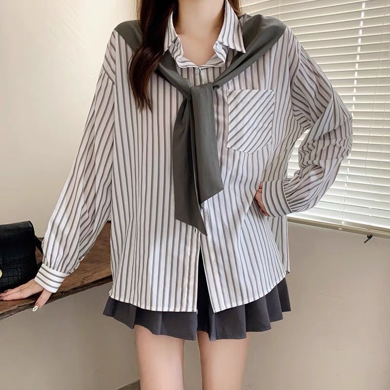 Zestaw zawiera: 1× damską koszulę w paski z kolorowymi wstawkami i dołączonym szalem